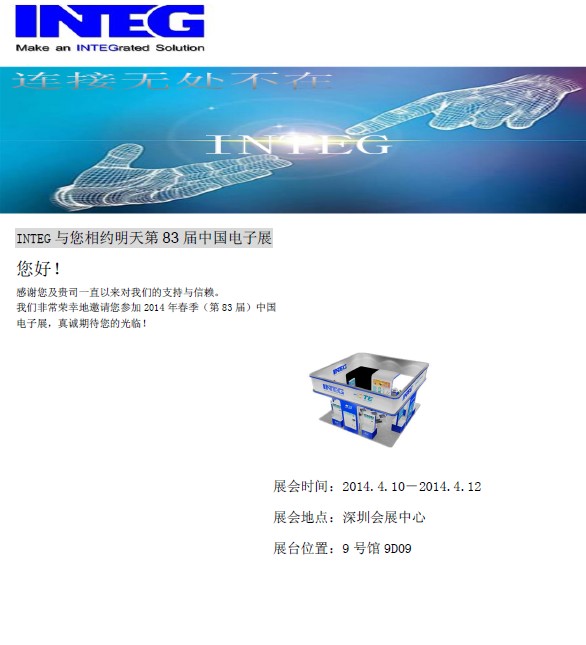 尊敬的客戶,感謝您一直以來對我們的支持, 我司參加了83屆中國電子展, 屆時將展示我司的所代理的產品線和最新的連接解決方案,我司展位在深圳會展中心, 9號館  9D09, 參展時間是4月10日至12日,