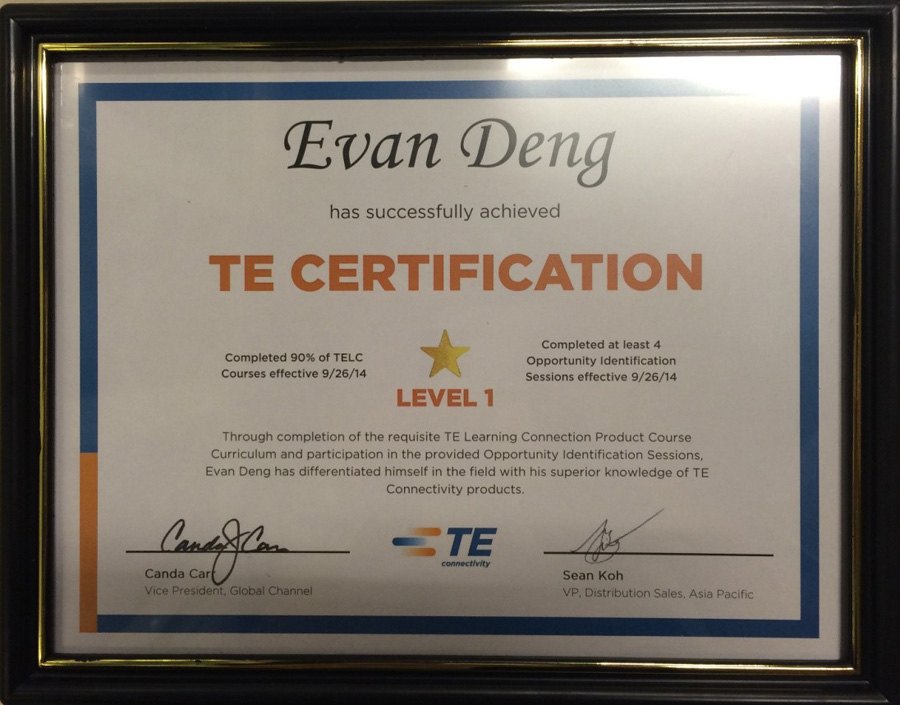 在TELC項目中,我司的業務部鄧經理是亞太區第一個獲得TE的認證, 希望以后我司會以更專業的技術知識服務于客戶。