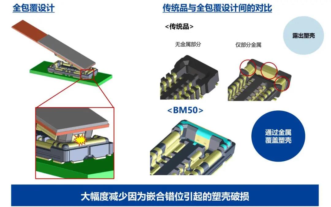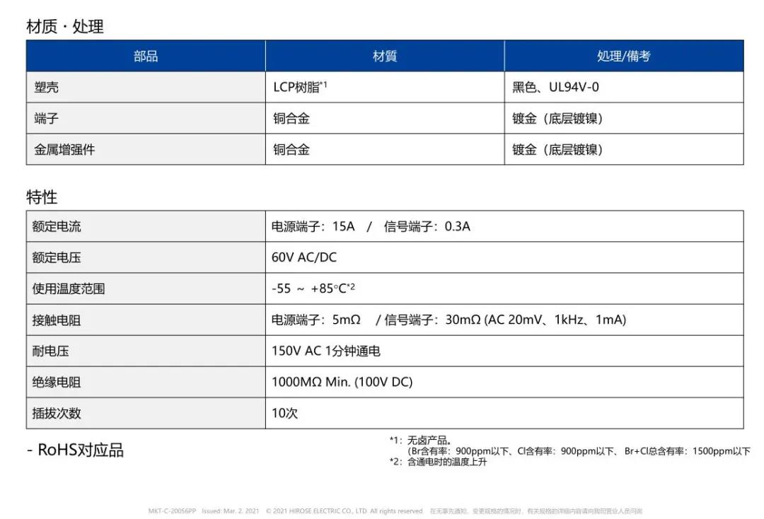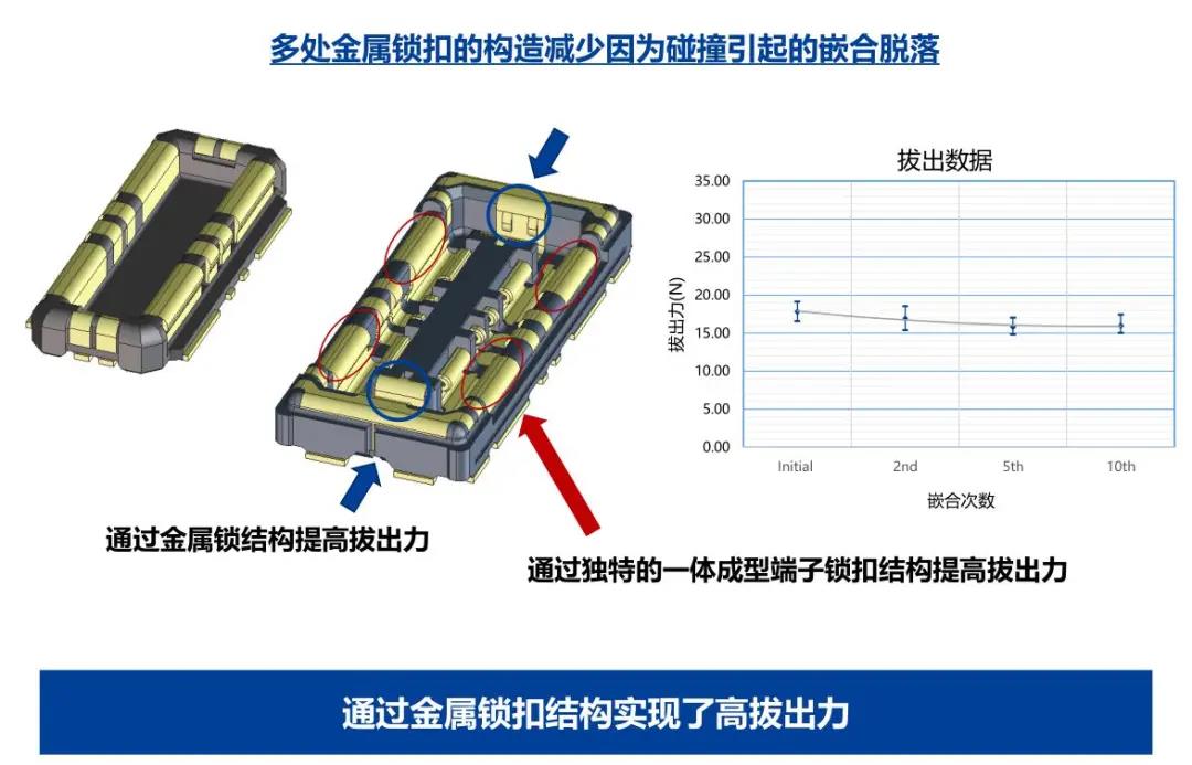 特點 1 兼顧供電能力和小型化的設計 - 額定電流:支持電源端子15A、信號端子0.3A - 嵌合高度:0.6mm、縱深:2.0mm 2 通過全包覆構造,確保高牢固性 3 使接觸電阻最小化,節省電力 4 實現小型,高抜出力 5 互相夾緊型多觸點構造,確保高接觸可靠性 有助于小型化&大電流化
