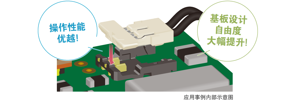 垂直嵌合不影響其他元器件,有效節省空間,提高基板設計自由度。采用從上向下的嵌合方式,易于確認嵌合口,從而更好地確定插